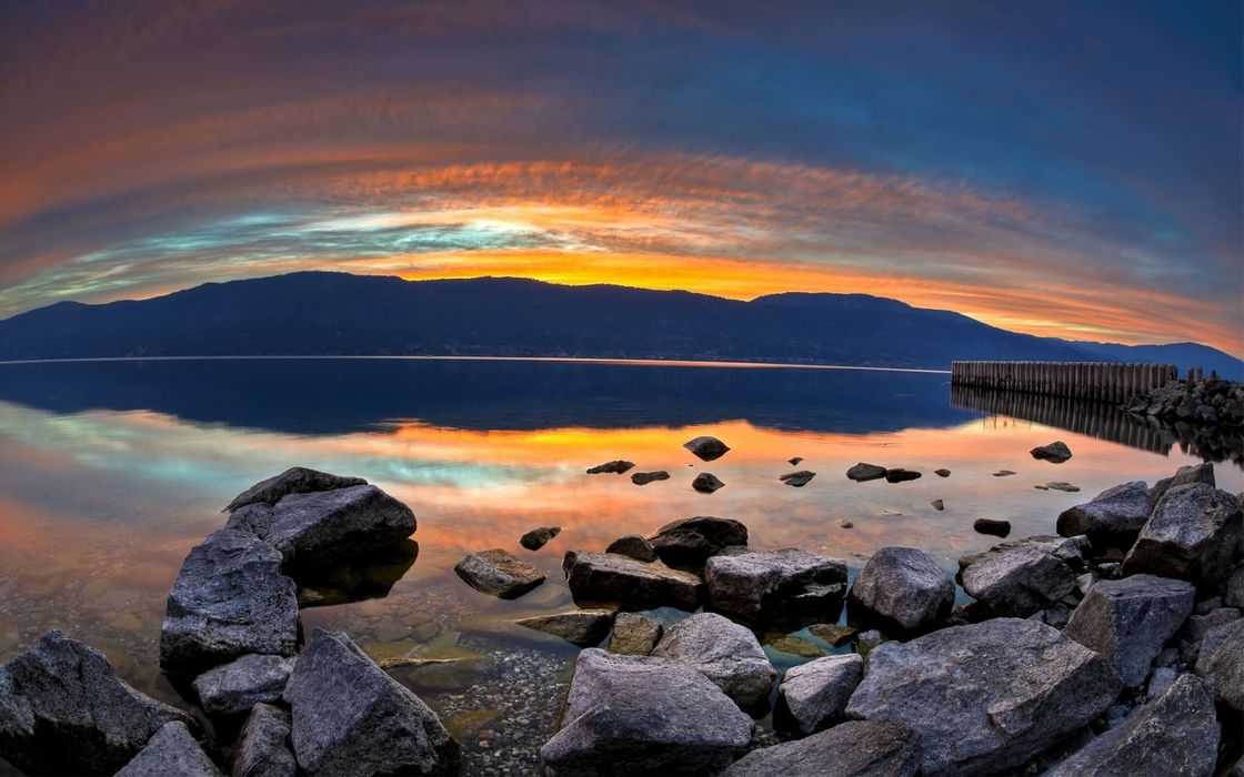 Okanagan Lake Okanagan Lake is one of Canada’s favorite summer destinations. The lake spans 110 kilometers (68 miles) from north (Vernon) to the south (Penticton) and is 232 meters (780 feet) deep. Its refreshing waters provide endless summer fun, from boating, fishing, diving and swimming to exploring its many mysteries: tombs and lake creatures, hidden coves…
